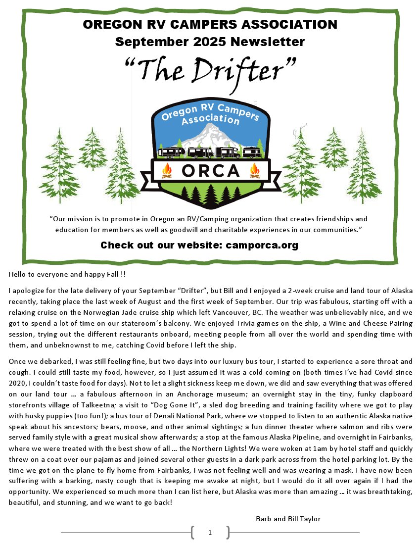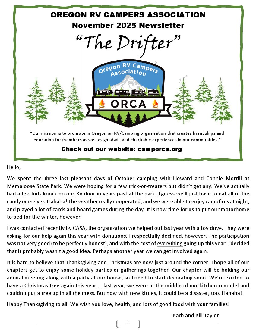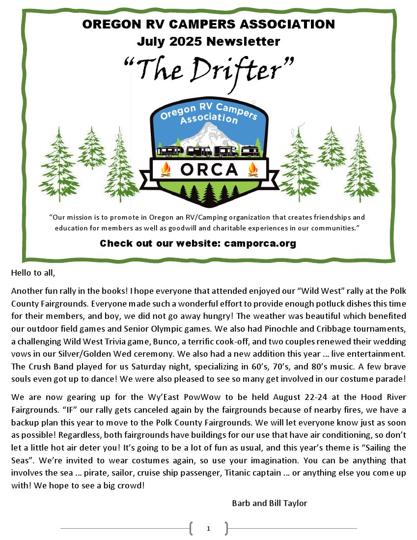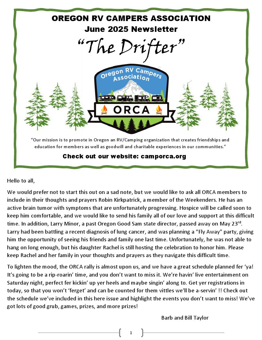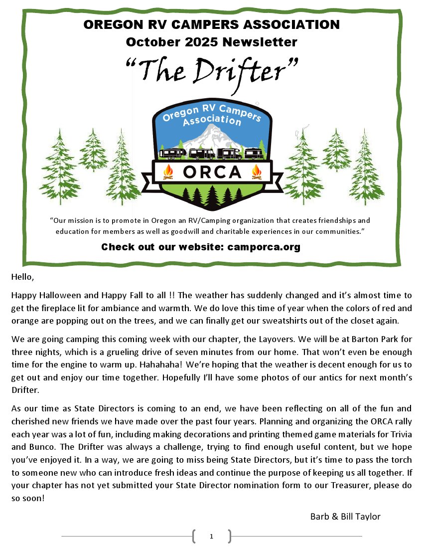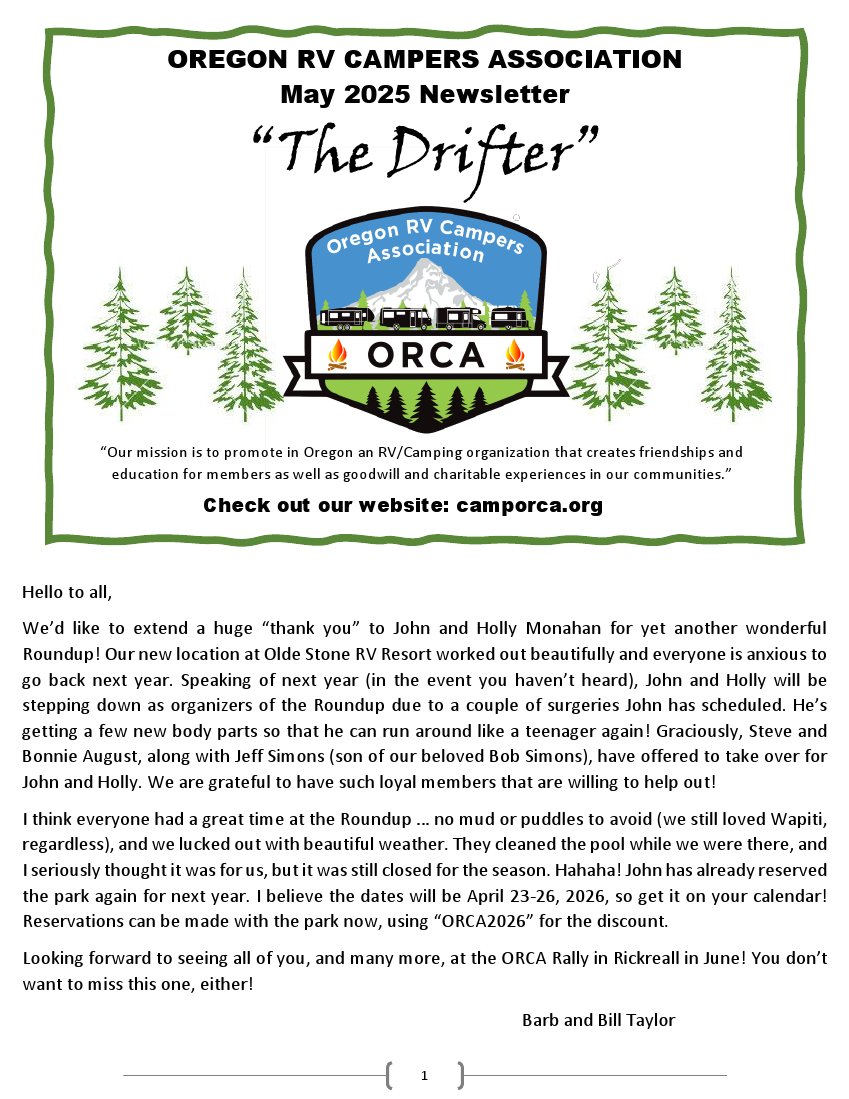 Please send comments, suggestions, or inquires to Barbara at ORCADirector@outlook.com.